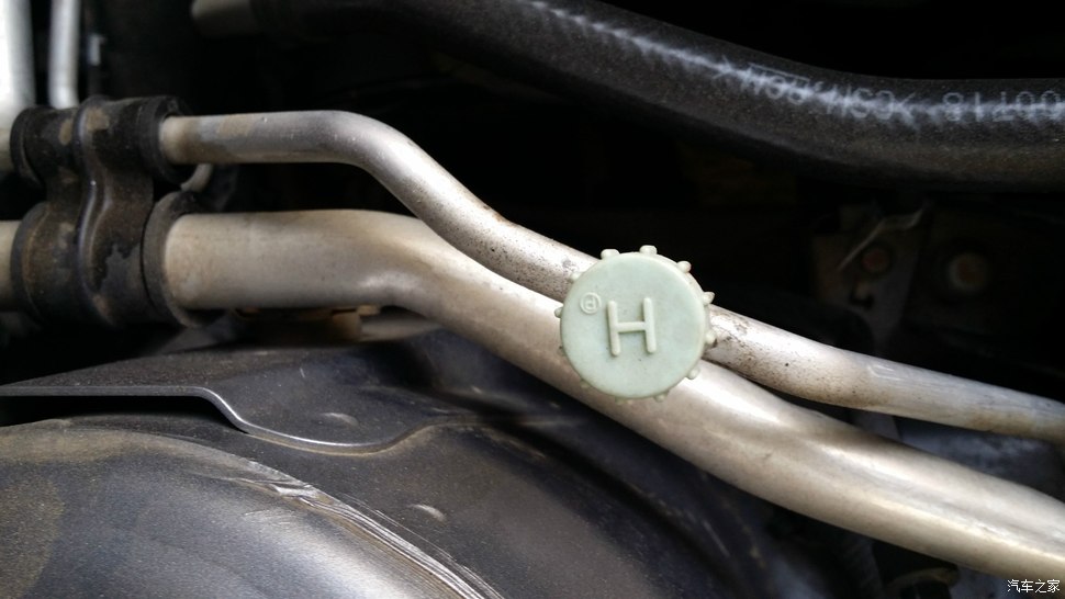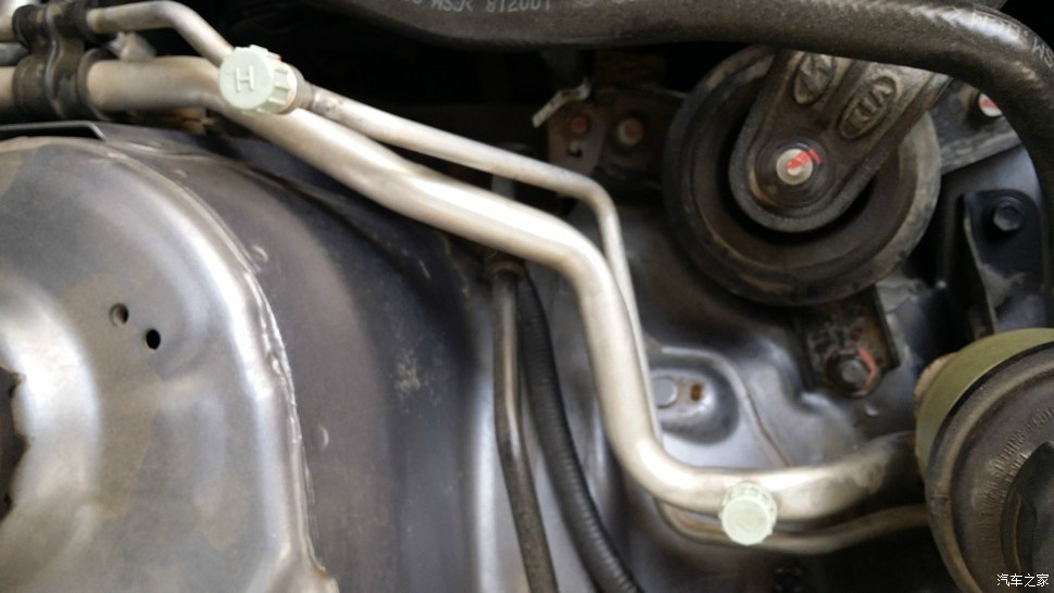 4、打开引擎盖,找到铝合金管(一般在左边),一根管子上有绿色的防尘盖,上边标有“H”的是高压管,上边标有“L”的低压管,制冷剂就是要从低压管注入。