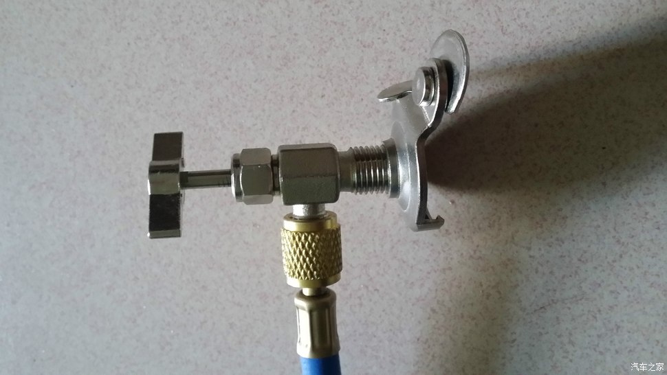 5、接着把开瓶器拧在制冷剂口,转动旋钮,直到感觉紧了停止。