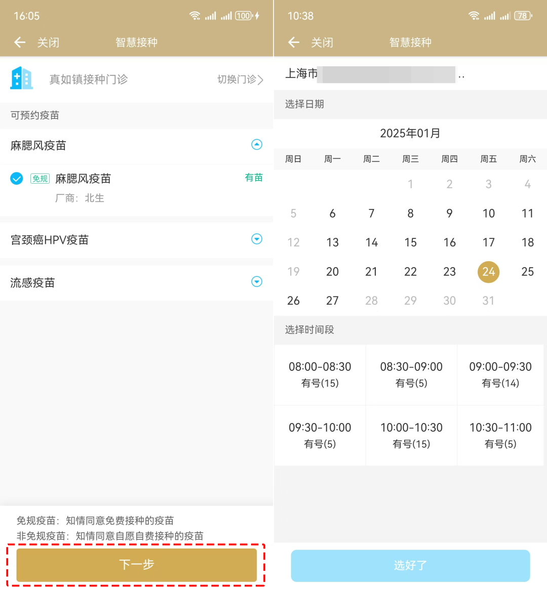 选择受种者需要预约的疫苗、接种点信息后,点击“下一步”→选择受种日期和时间;