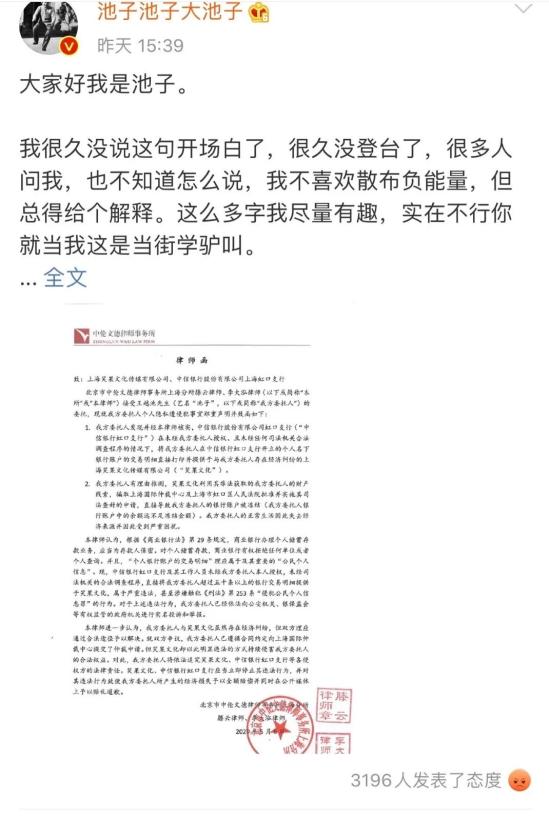 “你也没有我的身份证,你也没有我的银行卡,你也没有司法机关的调查令,笑果文化竟然能从中信银行拿到我近两年的流水还打印出来,你为什么不干脆把余额全取出来拿走呢?”池子在博文中对笑果文化及中信银行未经授权擅自泄露其个人信息的行为表示了强烈谴责。