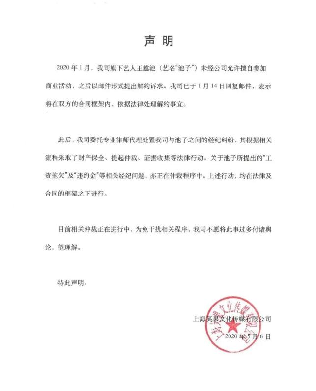 针对此事,5月6日晚,上海笑果文化在微博上回应称,相关仲裁正在进行中,其“根据相关流程采取了财产保全、提起仲裁、证据收集等法律活动”,且上述行动“均在法律及合同的框架之下进行”。