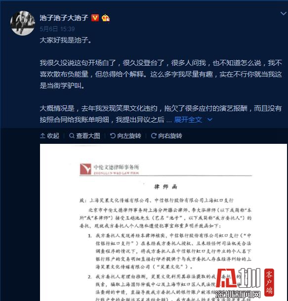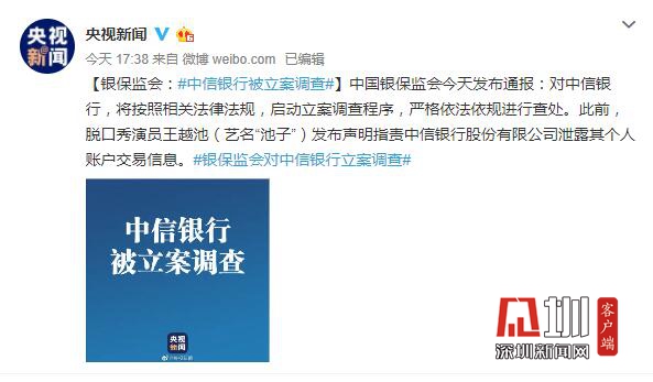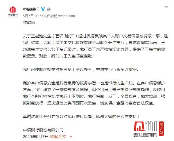 见圳客户端•深圳新闻网2020年5月9日讯(见圳客户端•深圳新闻网记者张玲)近日,关于中信银行上海虹口支行向笑果文化提供笑果文化前艺人王越池(艺名“池子”)银行个人帐户近两年的交易明细一事在网络上引发争议。当事人“池子”5月6日在个人微博上贴出律师函。5月7日凌晨,中信银行发布致歉信,向王越池道歉,并对相关员工予以处分,对支行行长予以撤职。