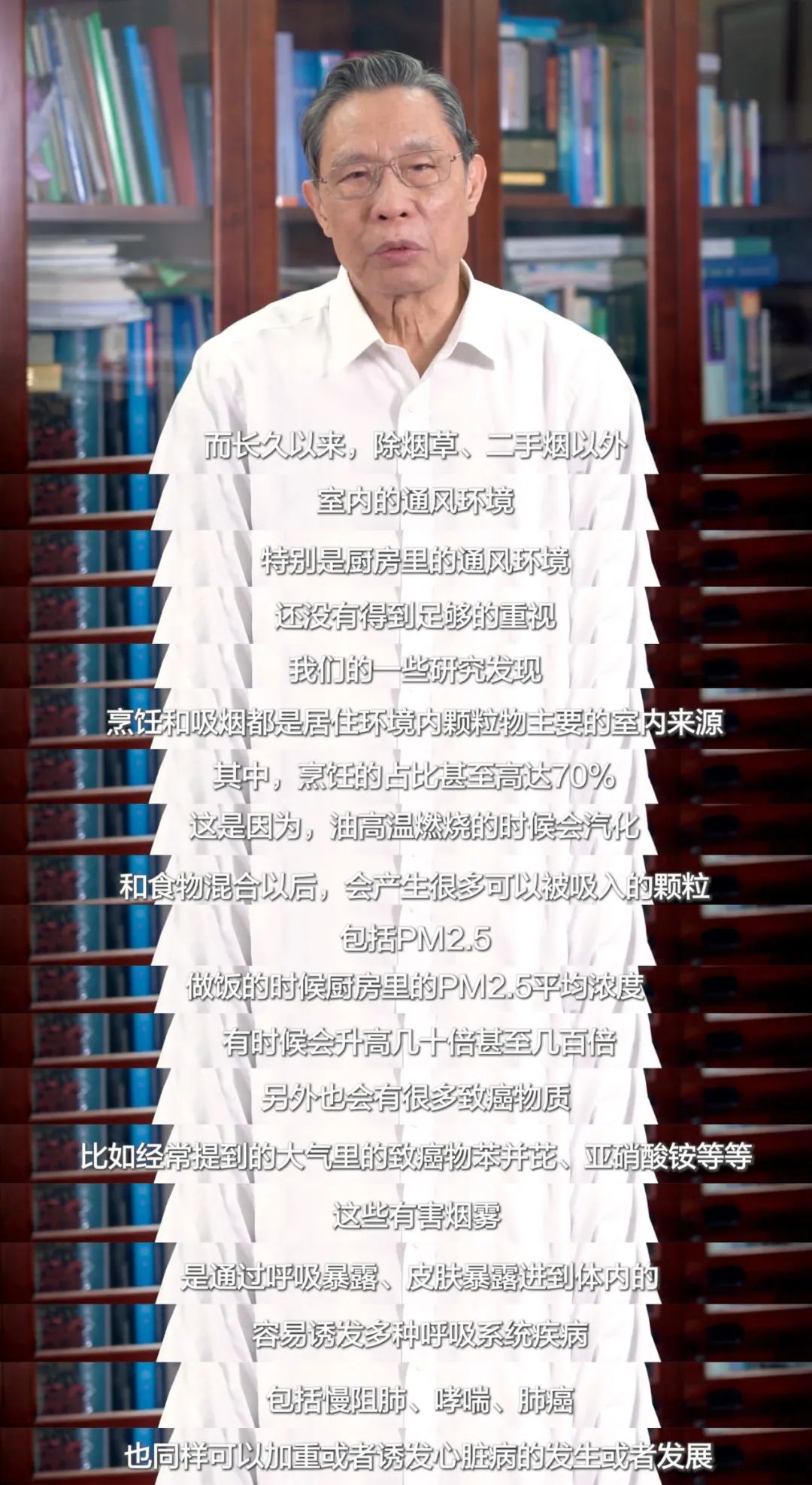 “临床上发现,在不吸烟女性肺癌患者的肺癌危险因素中,除了二手烟以外,也有相当大一部分,甚至超过60%的患者长期地接触厨房油烟。”钟南山说。⑤