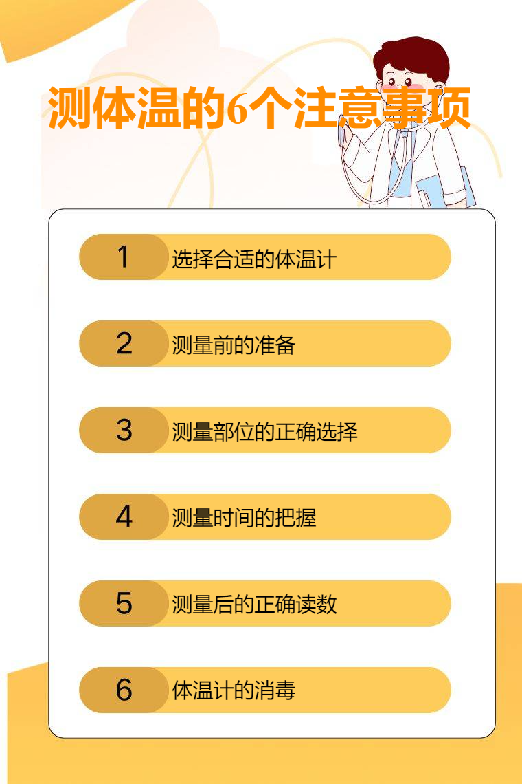 测体温时需要注意选择合适的体温计、测量前的准备、测量部位的正确选择、测量时间的把握、测量后的正确读数以及体温计的消毒等。
