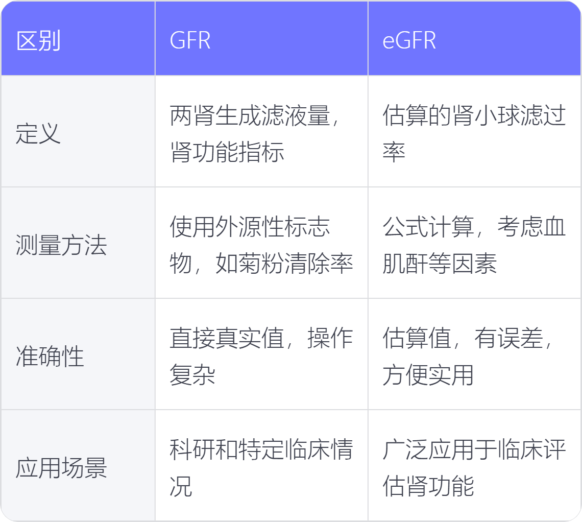 4.应用场景:GFR主要用于科研和一些特定的临床情况;eGFR则广泛应用于临床,作为评估肾功能、诊断慢性肾脏病及判断其分期的重要依据。