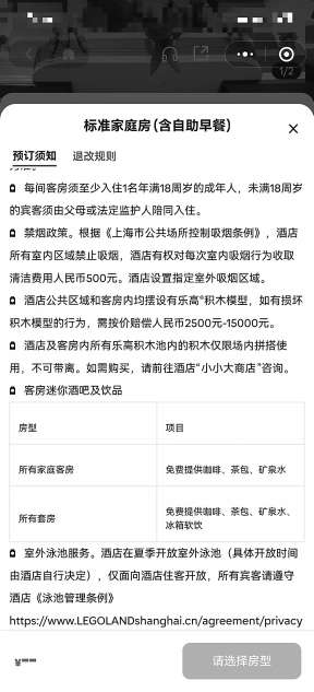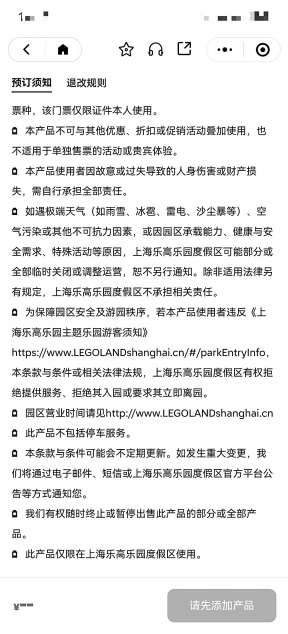 在上海乐高乐园的门票及酒店预订须知里,均有“如遇极端天气(如雨雪、冰雹、雷电、沙尘暴等)、空气污染或其他不可抗力因素,或因园区承载能力、健康与安全需求、特殊活动等原因,上海乐高乐园度假区可能部分或全部临时关闭或调整运营,恕不另行通知。除非适用法律另有规定,上海乐高乐园度假区不承担相关责任”的表述。