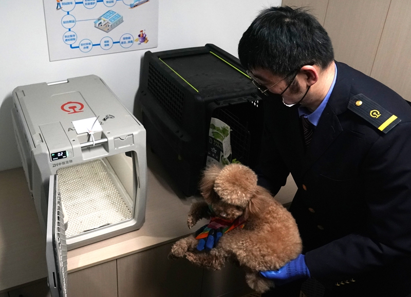4月10日,在中铁快运上海虹桥站营业部门口,中铁快运上海分公司经理展示高铁专用宠物运输箱。