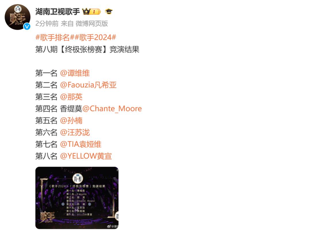 第一名:谭维维;第二名:Faouzia凡希亚;第三名:那英;第四名:香缇莫;第五名:孙楠;第六名:汪苏泷;第七名:袁娅维;第八名:黄宣。