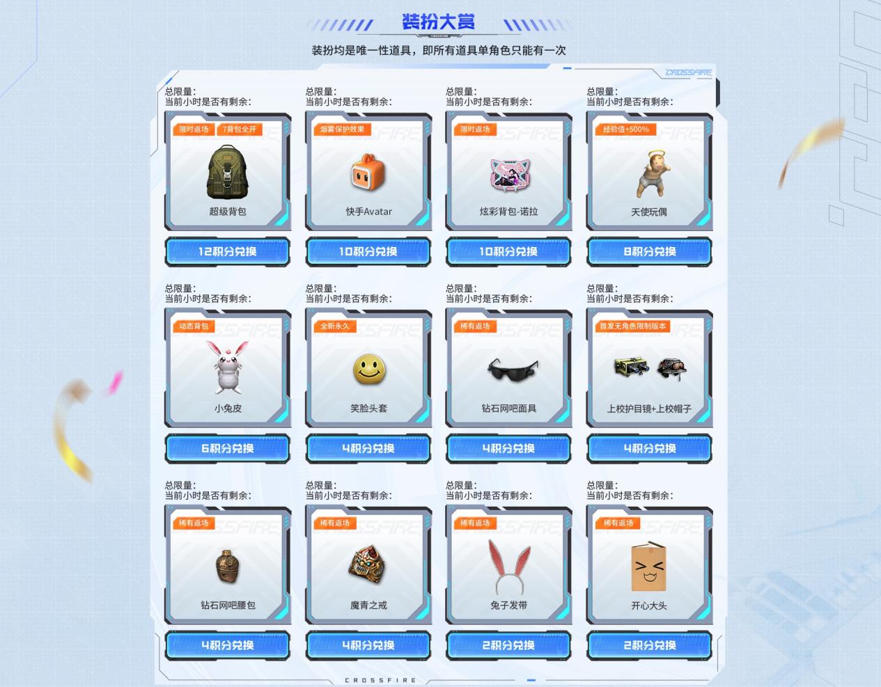 除实用武器道具之外,本次17周年庆典兑换奖池中还有大量趣味装扮欢迎各位CFer兑换领取,超级背包也将限时返场加入奖池,还有快手Avatar、炫彩背包-诺拉、天使玩偶等兼具实用效果的装备同样可以直接兑换。