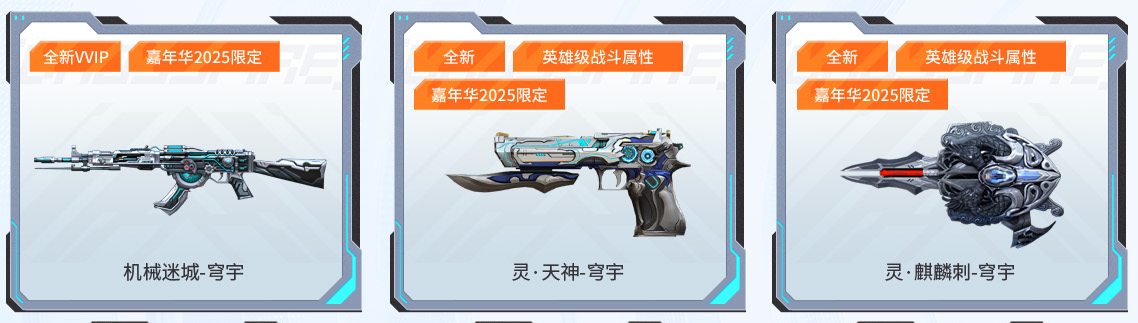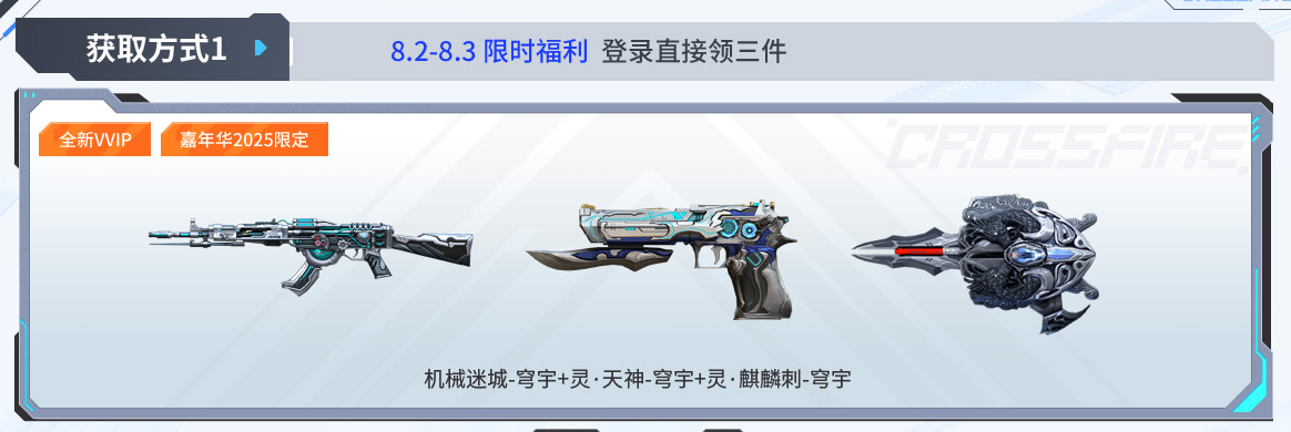 8月2日至31日期间,史上最强周年福利限时开放——CFer只需在8月2日至3日期间登录游戏即可直接领取嘉年华2025限定武器套装!超低门槛获得全新VVIP武器机械迷城-穹宇+灵·天神-穹宇+灵·麒麟刺-穹宇的机会不容错过。