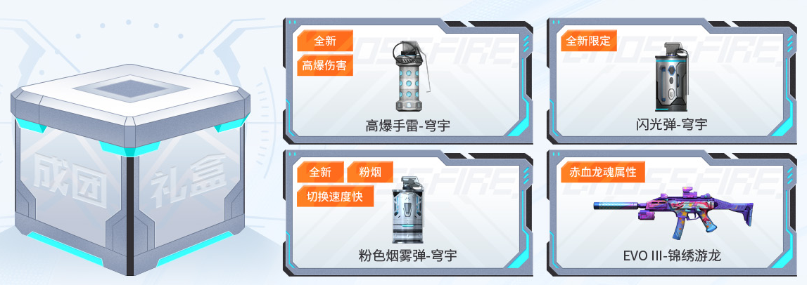 成功领取穹宇系列武器后,CFer将同步获得建立/加入团队解锁更多福利的珍稀机会,活动期间团队达到3人即可获得1次抽奖机会,团队达到5人后则将自动解散团队并增加团队所有成员的抽奖机会,有机会抽取获得高爆手雷-穹宇、闪光弹-穹宇、粉色烟雾弹-穹宇、EVO III-锦绣游龙等好礼。