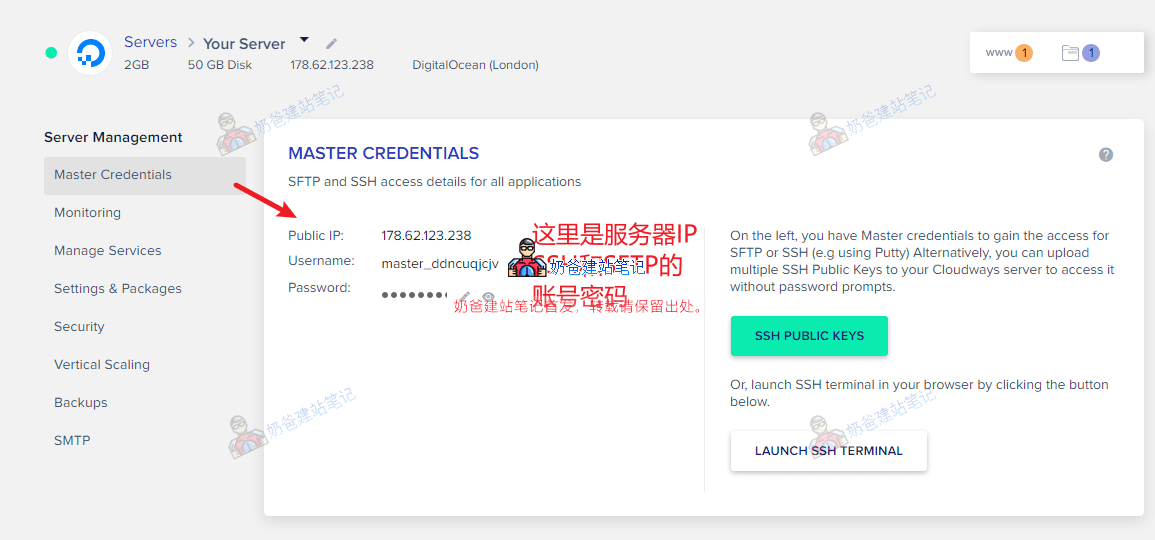 在Master Credentials界面,可以看到你的服务器ip(Public IP),SSH/SFTP的账号(Username)和密码(Password)