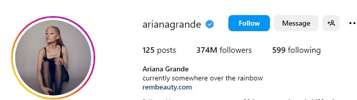 The renowned global sensation Ariana Grande is the sixth most followed person on Instagram. She is an acclaimed American singer and songwriter who has garnered widespread recognition for her chart-topping hits such as "The Way," "7 Rings," "In My Head," "Focus," "Break Free," and numerous others. Notably, she is also celebrated for her noteworthy foray into the cosmetics industry with her venture, REM Beauty.