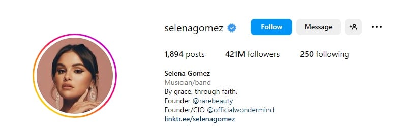 Securing the third position on the list of most followed Instagram accounts, Selena Gomez commands an impressive 420 million Instagram followers. As an American musician of distinction, she also holds the esteemed title of founder of Rare Beauty, an influential brand.
