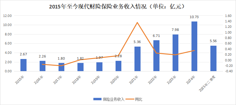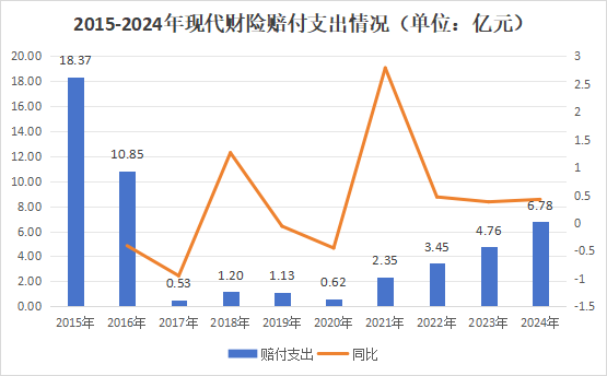 从承保端来看,在经历下降后,2017年达到低谷1.8亿元,随后2018年开始持续增长。2021年,现代财险实现保险业务收入5.36亿元,同比增长135%,规模几乎是上一年的2.35倍,此后一直维持着增长状态。2024年保险业务收入首次突破10亿元,达到10.73亿元,同比增长34.46%。整体来看,该公司保险业务收入呈现上升趋势。