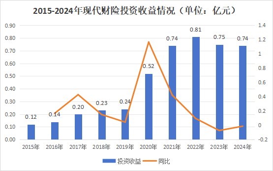 从投资端来看,现代财险早期一直处于增长状态,于2022年达到顶峰0.81亿元。2023年开始逐渐下滑,2024年下降至0.74亿元。