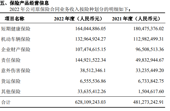 转型后,该公司规模迅速扩张。此前仅有北京、青岛两家分公司,转为合资后又陆续新开设广东、湖北、四川3家分公司。除增设分支机构外,现代财险同时着手业务转型。短期健康险逐渐取代企财险成为发展的主力险种,2021年、2022年,连续两年成为现代财险第一大险种。值得注意的是,由于有滴滴旗下全资子公司的迪润科技作为股东,2021年,车险同样反超了企财险,仍然作为该公司的第二大险种。2022年,车险被责任险反超,位居第三。