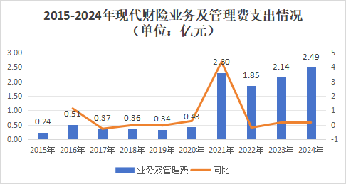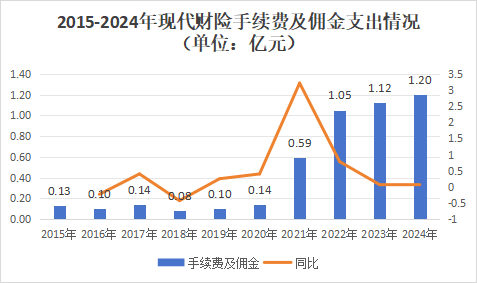 2021年,现代财险的手续费及佣金支出显著增长,达到0.59亿元,同比增长321.43%。2022年仍有增势,达到1.05亿元,同比增长77.97%。随后开始平缓增长,2024年达到1.2亿元。