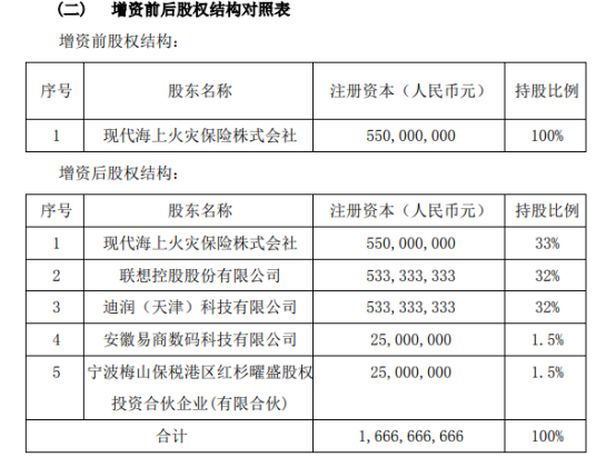 然而,金兑勋上任仅4个月后,2019年7月,酝酿已久的答案揭晓:现代财险官网公告显示,联想控股、迪润科技各注资5.33亿元,以32%持股比例入股,安徽易商数码科技与宁波梅山保税港区红杉曜盛各注资0.25亿元,持股比例1.5%,现代海上火灾保险株式会社出让控股权未参与增资。公司注册资本增加至16.7亿元。