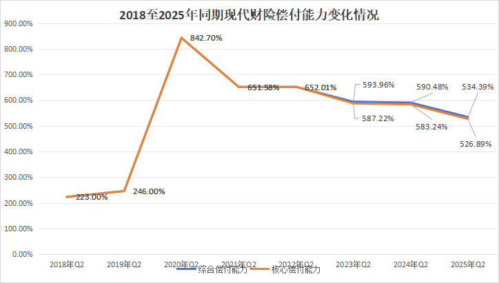 2018年至2022年间,二季度的综合偿付能力和核心偿付能力均相同。2023年开始,两者有细微不同出现。从偿付能力来看,2020年骤升达到顶峰842.70%,此前获得了联想控股和迪润科技的增资。