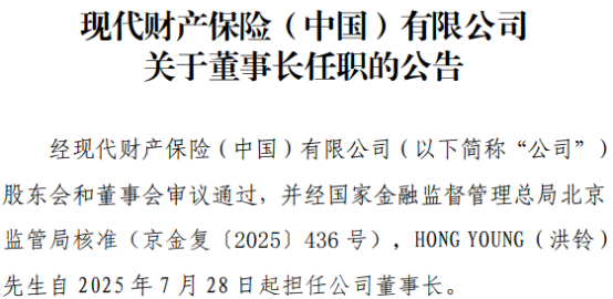 2025年8月,现代财险发布重大事项公告,经北京金融监管局批复,HONG YOUNG(洪铃)自2025年7月28日起担任该公司董事长。
