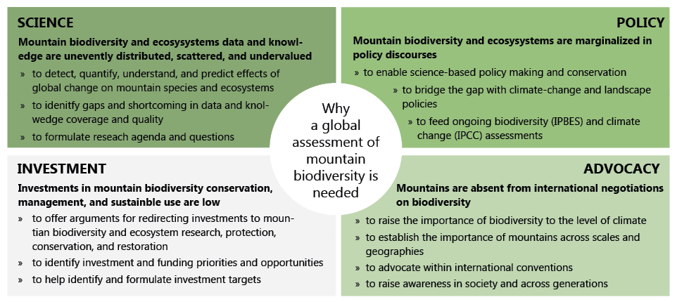 Mountain biodiversity is uniquely rich and important for ecosystem services, human wellbeing, and for global sustainability, but it is also increasingly threatened. Accordingly, its protection has been internationally recognized, for example in the United Nations’ Sustainable Development Agenda (SDG 15.4) and through the Convention on Biological Diversity (CBD) Work Program on Mountain Biodiversity. Yet, neither the state of our knowledge about mountain biodiversity nor current trends in mountain biodiversity have to date been systematically synthesised, globally or regionally. No assessment exists yet that taps into the wealth of information that has become available on mountains, their ecosystems, and their species.