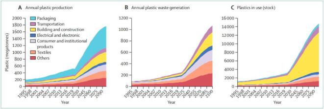 2000 年至 2100 年全球塑料生产、塑料废弃物产生量以及塑料使用总量及各行业使用量的趋势