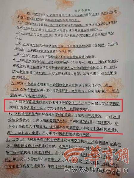 而对于购房者争议最大的延期交房的万分之0.1违约赔偿条款,该负责人称经协调,开发商这边已经同意改为万分之一。“之前万分之0.1时是开发商这边,参考了市场上多家购房合同确定的,目前来看确实过低,现已进行调整。”他说,“合同中存在的其他不解或争议部分,开发商这边会积极和购房者解答协商。”