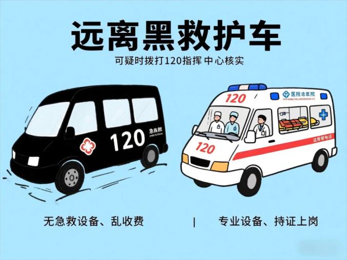 7.正规救护车有“120”标识、所属医疗机构简称、监督电话以及专业的急救医生和急救设备。黑救护车无正规标识,设备简陋且乱收费,发现可疑时拨打120指挥中心核实。