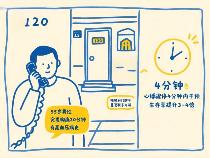 2.电话别急于挂断,调度员指导能救命,心脏骤停4分钟内启动高质量CPR并尽快除颤(如适用),患者生存率可提升3—4倍。