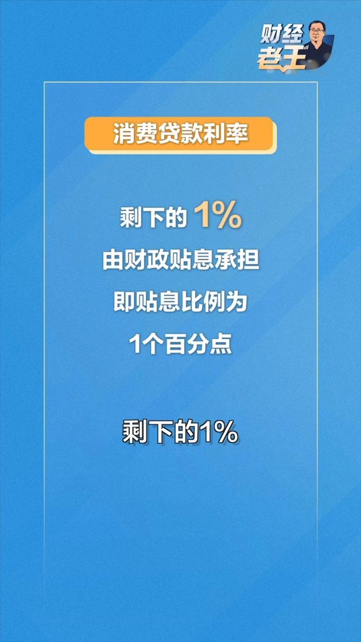 先说什么叫贴息。假设你有一笔消费贷款利率是3%,那么政策落地后就变成了2%,剩下的1%由财政补贴承担了。这就是政策里说的贴息比例为1个百分点的意思。