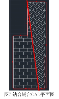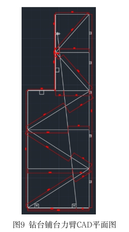 坍塌钻台铺台位于钻机井架立管外侧,铺台距地面高度为7.9米,铺台长为5.2米,铺台最宽处为1.7米。设计的固定方式:坍塌铺台与钻台前铺台用两个插销固定,坍塌铺台内侧用两个插销和一个单孔销轴与人字架固定,坍塌钻台铺台外侧用一斜撑杆通过单孔销轴与人字架连接固定。
