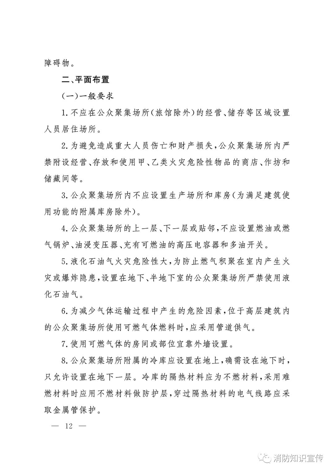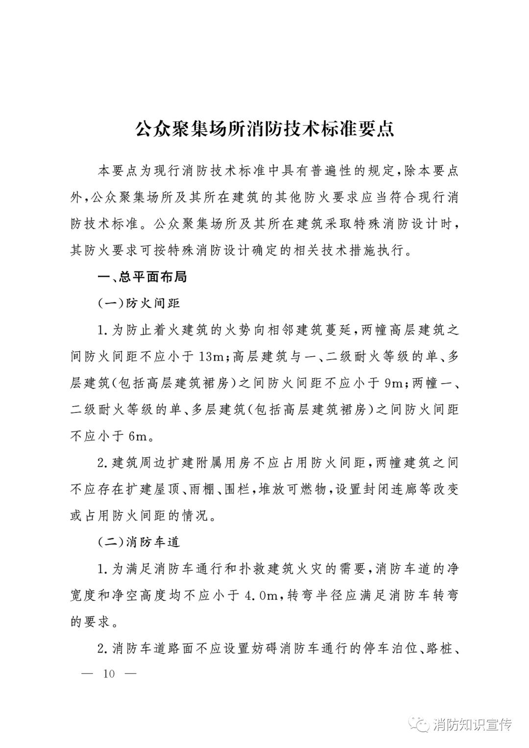 公众聚集场所及其所在建筑总平面布局、平面布置、防火分区及防火分隔、安全疏散、内外部装修、消防水源、消防设施、器材及标志、电气线路等应当符合消防法律法规和消防技术标准(要点详见附件〔1〕)。《公众聚集场所消防技术标准要点》的相关要求与新颁布实施的消防技术标准不一致时,执行新消防技术标准的规定。