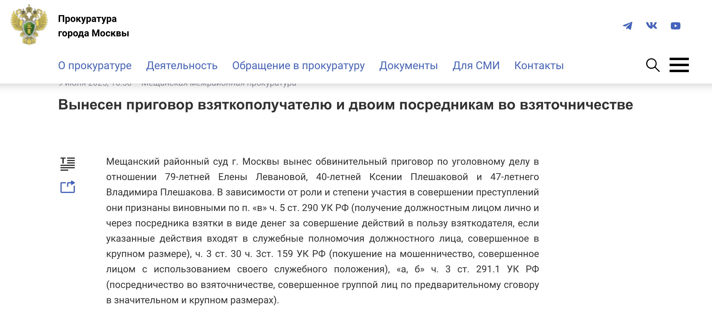 莫斯科检察院发布的Levanova案件判决结果公告。