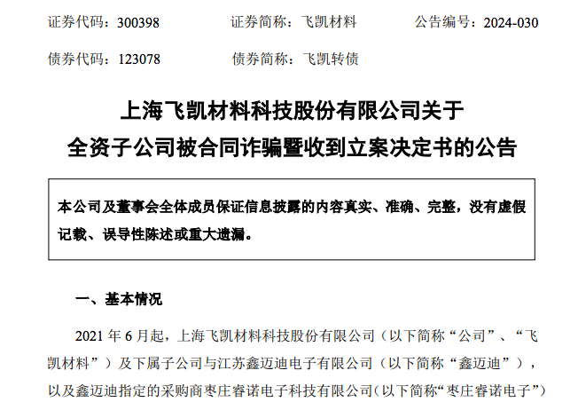飞凯材料表示,2024年3月15日,晶凯电子收到安庆市公安局宜秀分局出具的《立案决定书》:根据《中华人民共和国刑事诉讼法》第一百一十二条之规定,决定对晶凯电子被合同诈骗案立案侦查。目前飞凯材料及晶凯电子正在全力配合公安机关开展相关工作,争取最大限度减少损失。