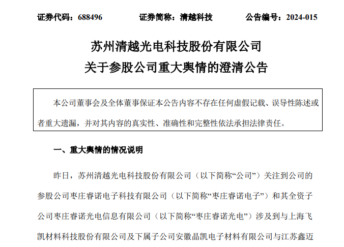 清越科技表示,针对媒体所报道的关于枣庄睿诺电子及枣庄睿诺光电与上海飞凯材料科技股份有限公司等企业有关的债务纠纷及立案情况,公司正在了解过程中,根据公司目前了解的情况,此次纠纷内容所涉及之上下游客户及供应商与公司均无任何业务往来。公司作为枣庄睿诺电子参股方委派了一名董事,枣庄睿诺电子日常经营管理均由其总经理实际负责,此次相关事项的制定与决策等均未提交枣庄睿诺电子董事会进行审议,公司并未参与该事项的决策及实施过程。