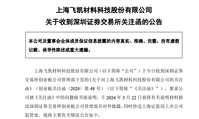 3月20日,飞凯材料收到深圳证券交易所下发的关注函,要求飞凯材料补充说明公司与鑫迈迪、睿诺电子和睿诺光电等实体签订若干购销合同的业务背景、原因,相关交易是否具有商业实质,结合该等交易的预期收益和风险敞口说明其是否具备商业合理性,相关交易是否存在变相财务资助或非经营性占用公司资金的情形。