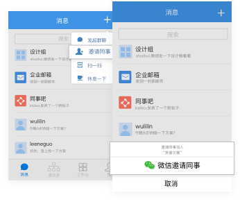 成功加入企业后,你可在消息列表右上角点击加号,在邀请同事入口用微信邀请同事加入。