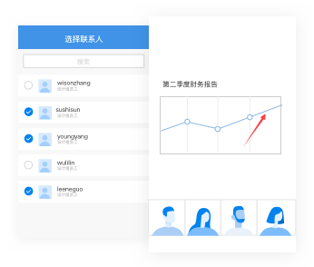 从群成员列表中选择参会人,支持9人同时接入。任意群成员可发起屏幕共享和文档共享。