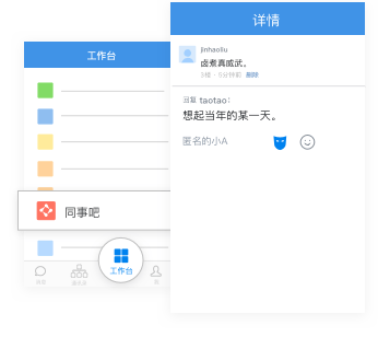 工作台进入同事吧,浏览同事发布的帖子,支持匿名评论。