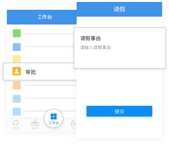 打开工作台的审批应用,手机随时提交审批,支持请假、报销费用、采购多种模板。