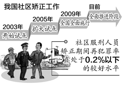 我国社区矫正工作从2003年开始试点,2005年扩大试点,2009年在全国全面施行,目前已进入全面推进阶段。目前,全国共有社区服刑人员73.1万人,已经累计接收了211.3万人,社区服刑人员矫正期间再犯罪率一直处于0.2%以下的较好水平。