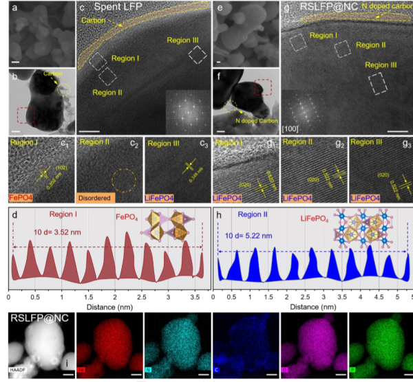 第三种直接回收方法是修复失效的磷酸铁锂正极材料及其氮修饰。失效的磷酸铁锂中存在明显的锂空位和锂铁反位缺陷。研究者开发出了多功能溶剂且添加锂源,通过水热或短暂煅烧的方式对锂空位或锂铁反位缺陷进行了同步修复,从而使其电化学性能得到了明显的改善,其界面稳定性、倍率性能和高低温性能有了显著提高。