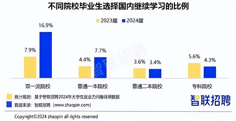就业市场对“双非院校”的硕博毕业生来说则更加不友好。智联招聘的报告中指出,“双非院校”的2024年硕博毕业生offer获得率为33.2%,较去年下降17个百分点,比“双非院校”本科生offer获得率(43.9%)整整低了10个百分点。