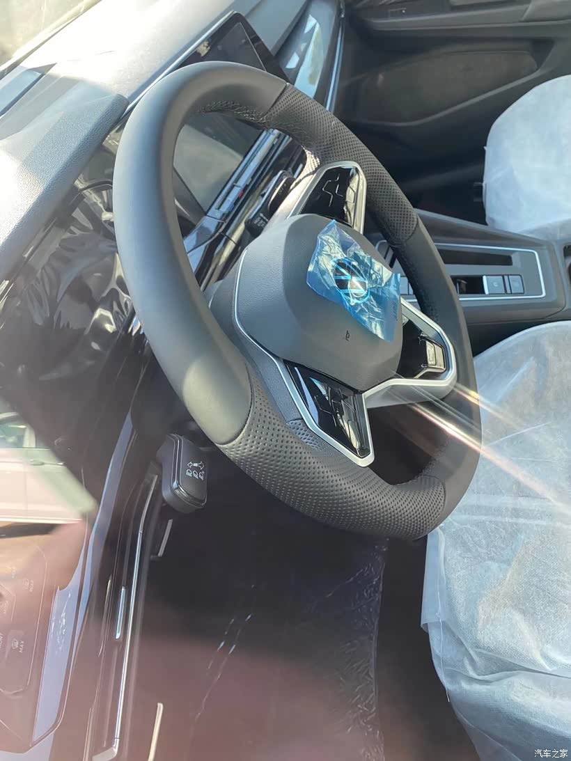 2.真皮方向盘粗壮握着非常的舒服,转向轻盈,路感也清晰。方向盘上面的按键都是触屏带回馈,很有质感。