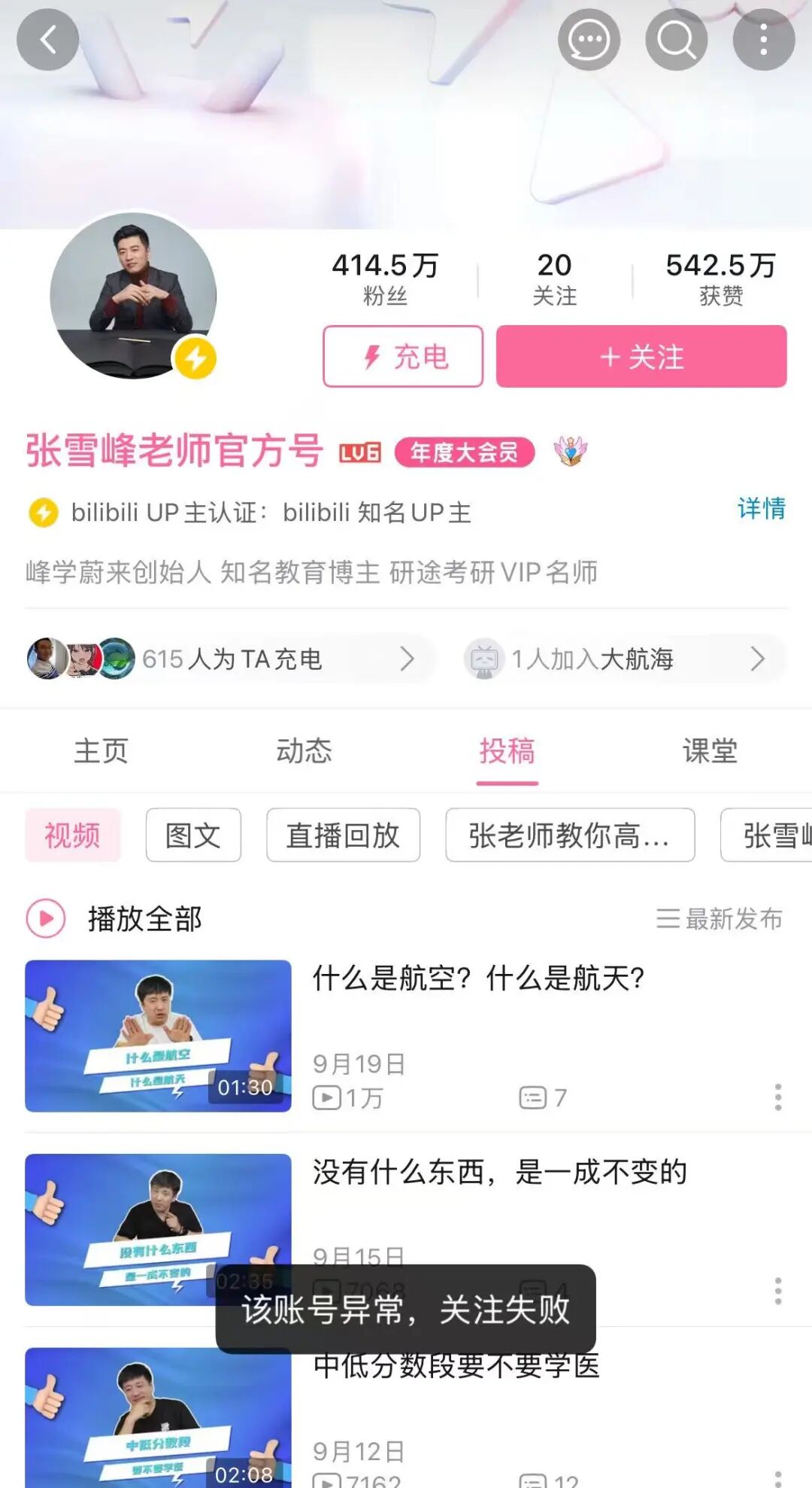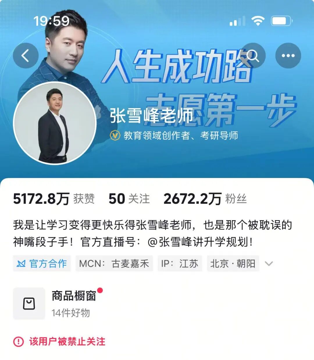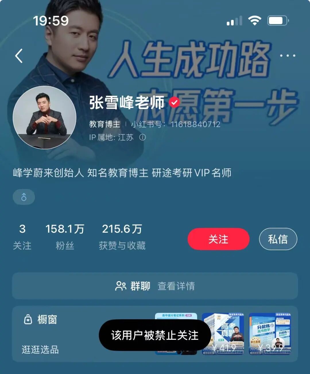 张雪峰多个账号被禁止关注。