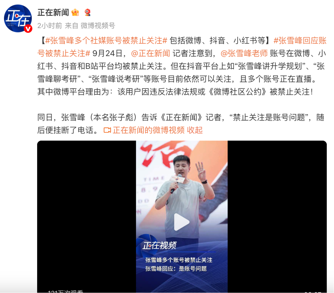 9月24日,张雪峰账号在微博、小红书、抖音和B站平台(以上四个平台合计粉丝超4000万)均被禁止关注。