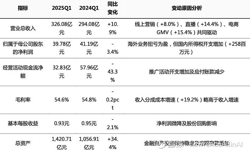 1.收入结构优化:直播业务收入同比增速(+14.4%)超过线上营销(+8.0%),反映内容生态变现能力增强。