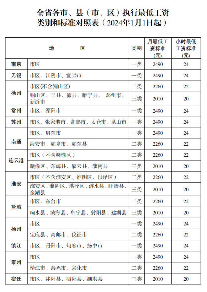 央视网消息:江苏省人力资源和社会保障厅1月15日下发通知,根据《最低工资规定》(原劳动保障部令第21号)和《江苏省工资支付条例》规定,经省人民政府同意,从2024年1月1日起调整全省最低工资标准。