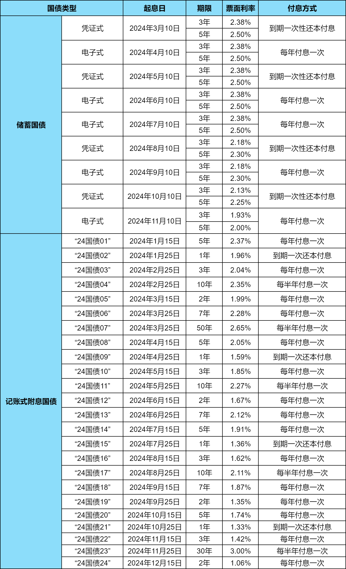 第一期“24国债01”,证券代码“019732”,期限为5年,票面利率为2.37%,利息每年支付一次。